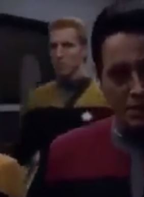 This male ensign talked to other crewmembers on the Promenade outside Quark's aboard Deep Space 9.