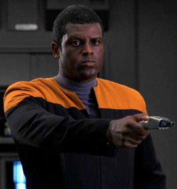 He was part of the day shift and came with Captain Janeway and Tom Paris in the turbolift to the bridge where he replaced a female officer at the tactical station. He remained at the tactical station during the encounter with a series 5 long-range tactical armor unit and its takeover of Voyager and was only briefly replaced by Tuvok. (VOY: "Warhead")