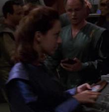 In 2377, this Human was affected by radiation when a mine exploded near Voyager's hull. She and the rest of the crew left in escape pods and were rescued by the Quarren, and treated for their radiation burns. However, what the crew didn't know was that the Quarren intended to alter their memories, and make them join their working class on Quarra.