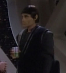 In 2381, he was browsing in a fine men's clothing store when Mariner and Boimler drove through in a kart while being chased by station security. (LD: "An Embarrassment Of Dooplers")