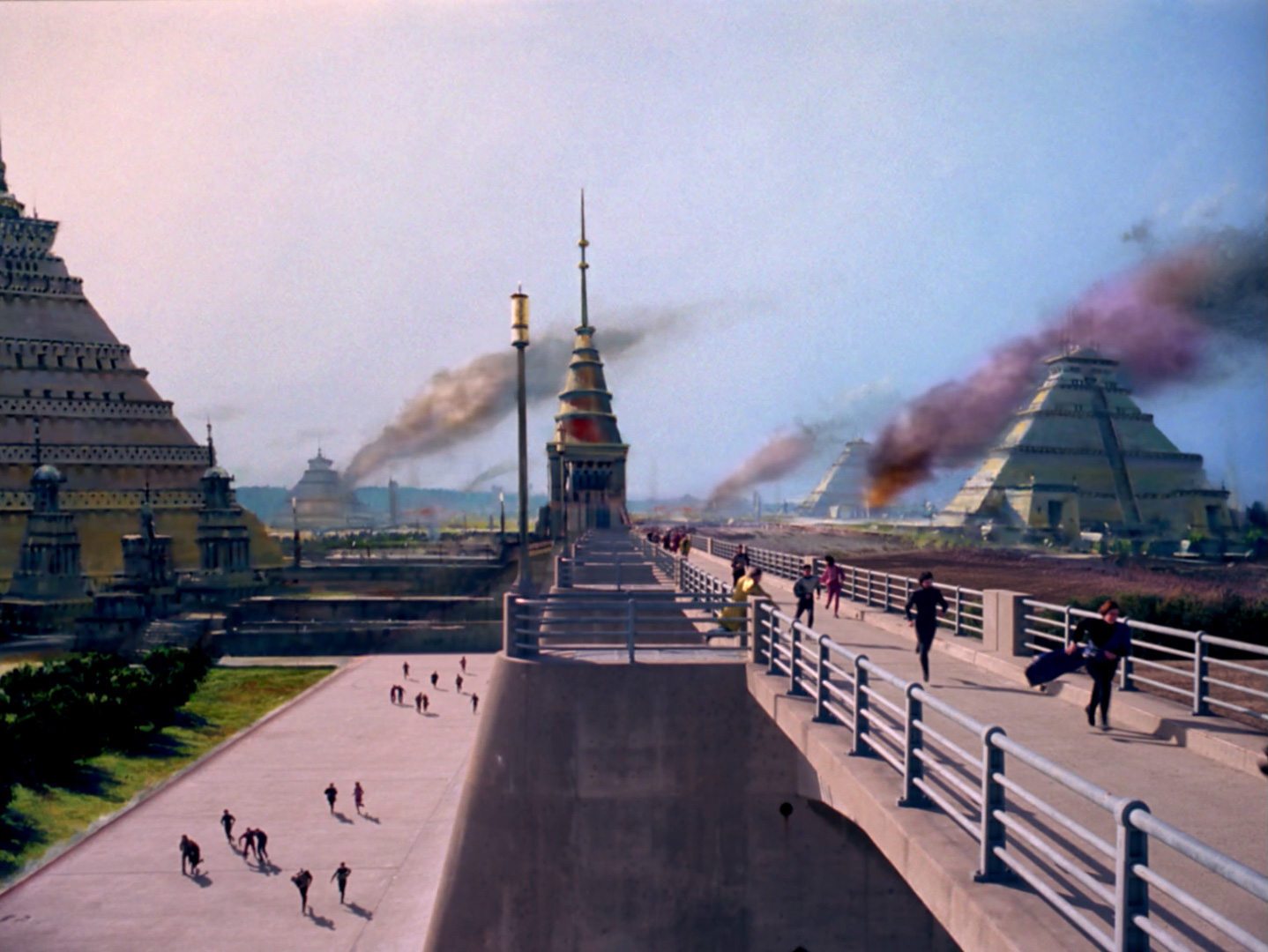 Several large cities of the planet Cheron were detected by the USS Enterprise in 2268. These cities were connected by traffic systems. They were uninhabited, with the unburied corpses of the inhabitants littering the cities.. Lower animals and vegetation were slowly taking over these dead cities. These cities were still burning centries after the Cheron Civil war had wiped out the native populations (TOS: "Let That Be Your Last Battlefield")