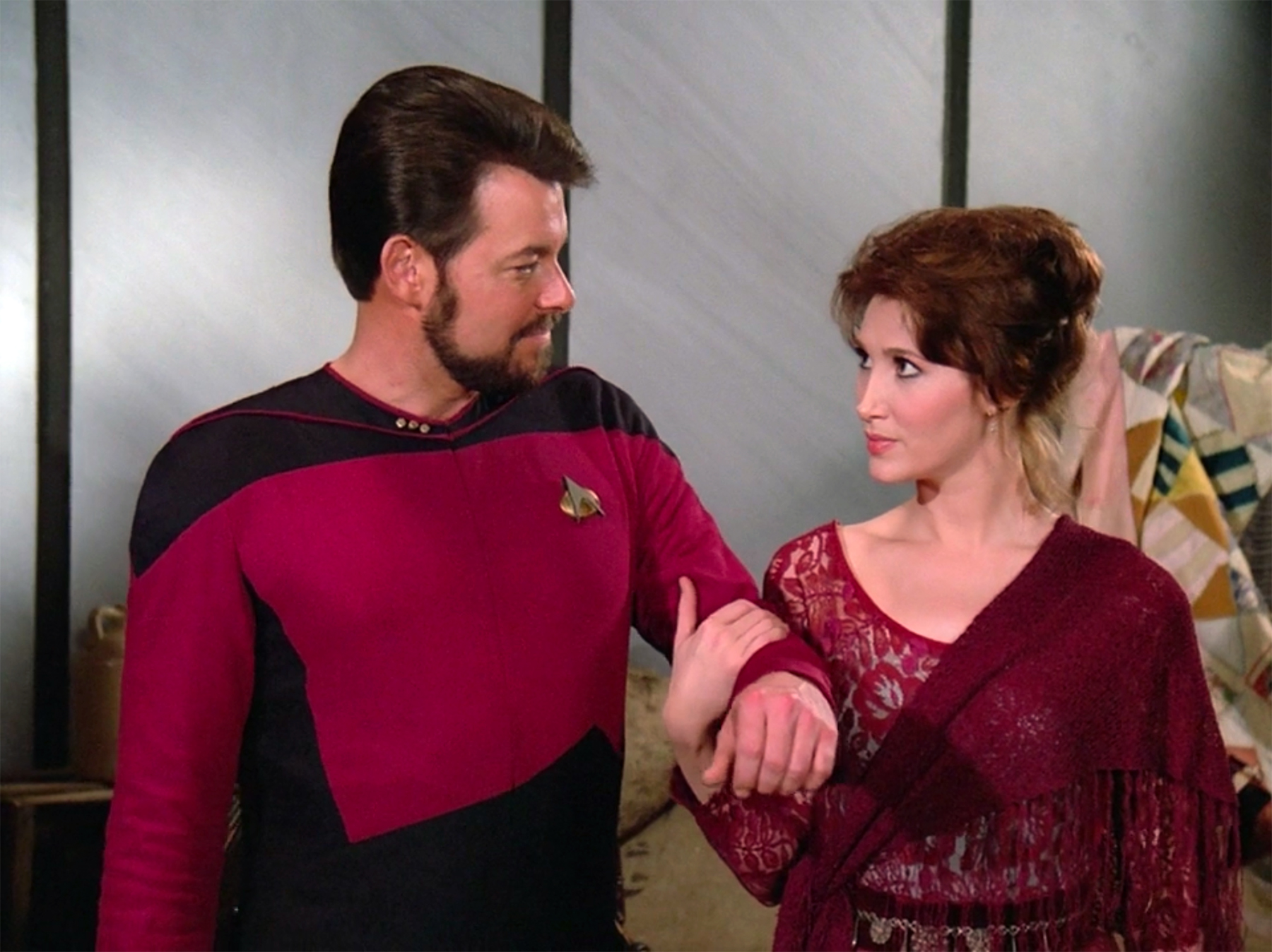Riker leads Brenna to his quarters. The first thing she sees is a mess, and she insists on starting to clean it up. The conversation gets rather spirited, with both of them making verbal jabs at each other. Eventually, the words give way to actions as Riker gives in to Brenna's advances and they passionately kiss.