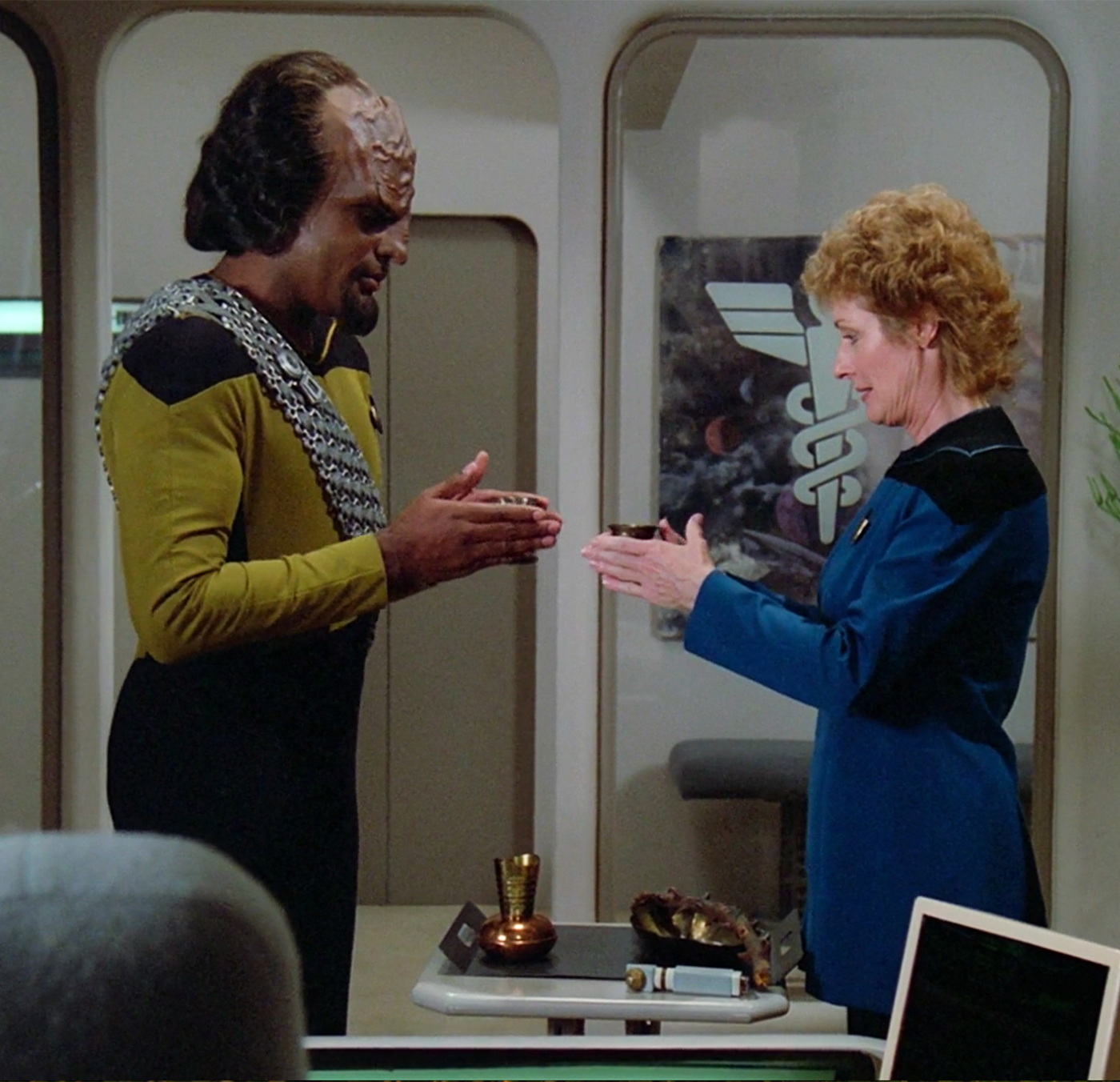 In appreciation and apology for earlier, Worf treats Dr. Pulaski to a Klingon tea ceremony in her office. Pulaski is aware of the nature of the plants used to make the tea, which is lethal to Humans, and antidotes herself so she can partake properly.