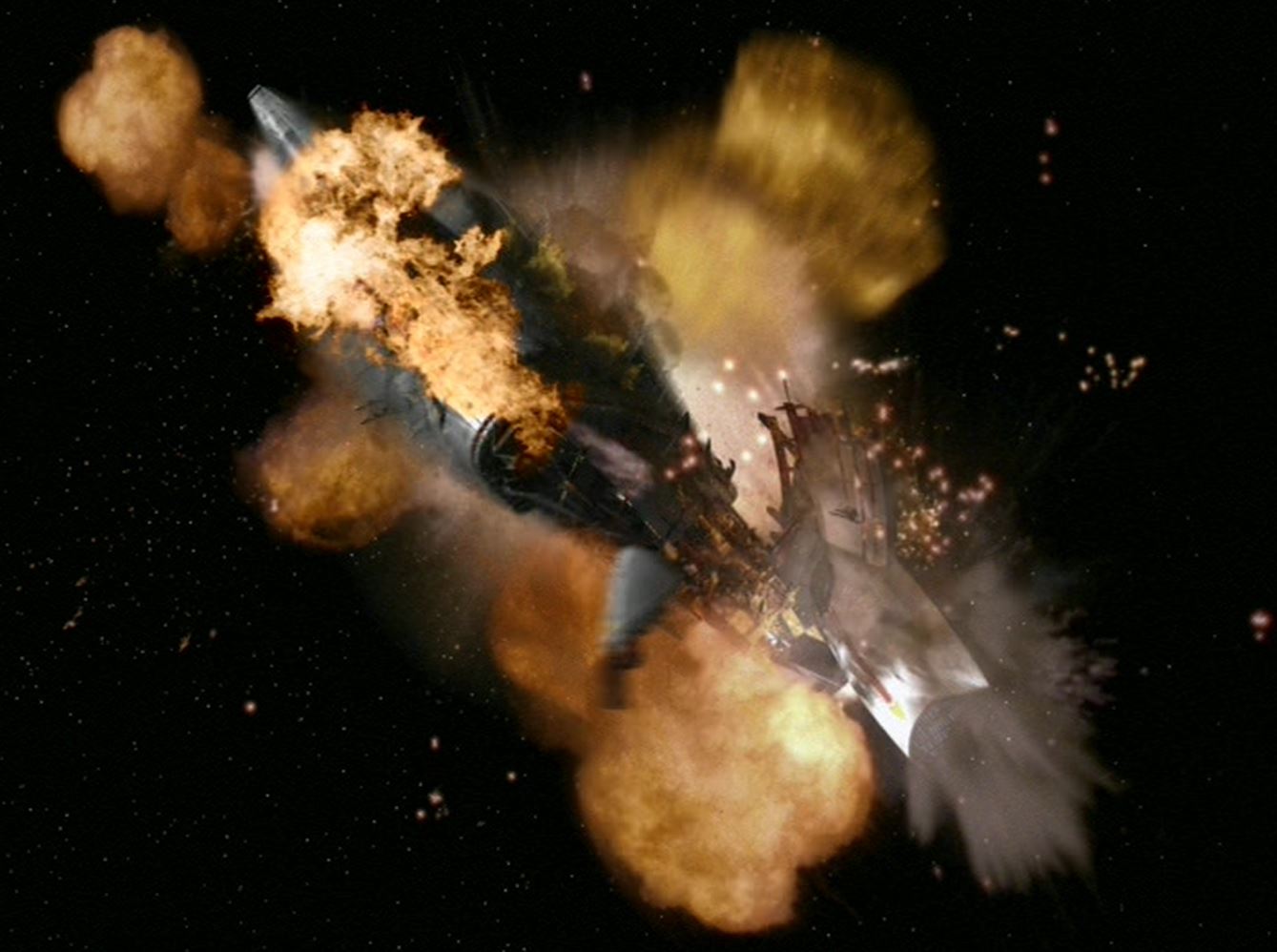 Only four pods are launched from the Valiant; two are destroyed by the battleship, and one is caught in an explosion as the Valiant is destroyed. The listing, rupturing hull of the Valiant hides from the battleship's view the one pod that gets away, carrying Nog, Jake, and Collins.