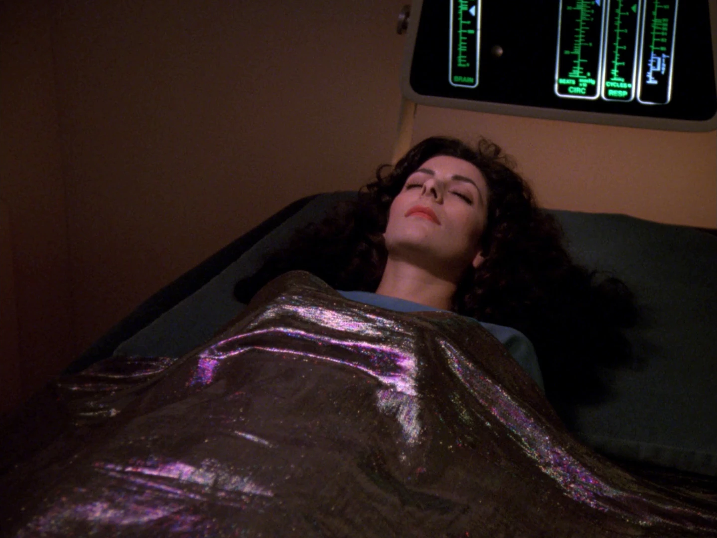 - "Captain's log, Stardate 45430.9. Counselor Troi has fallen into a deep coma. After a thorough examination, Dr. Crusher has been unable to find signs of illness or infection."