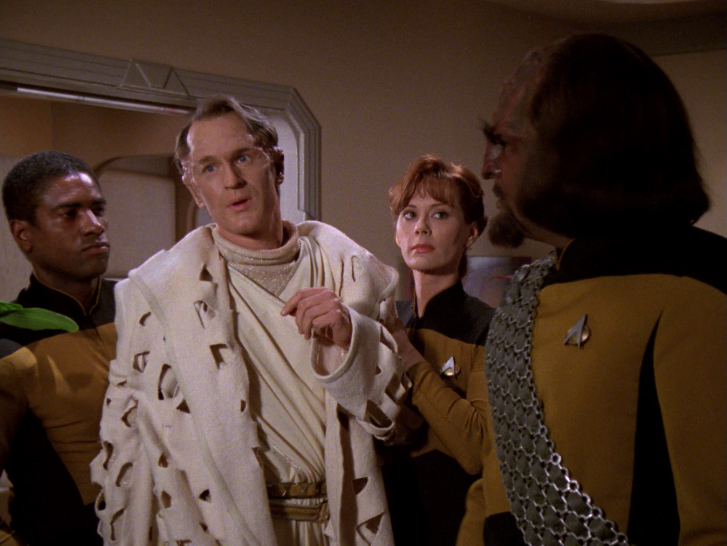 Three Ullians, Inad, Tarmin, and Tarmin's son Jev, have come on board the USS Enterprise-D. Interviewing Keiko O'Brien in Ten Forward, Tarmin probes her memory of a cup, which she knows is important but whose context she cannot recollect. With his help, Keiko remembers bit by bit that it was used by her obachan to wash brushes used in Japanese calligraphy. She thanks the Ullians for the retrieval of the pleasant memory. Tarmin attempts to persuade Dr. Crusher to undergo the probe but is reminded by Jev that they are not to probe people without permission.