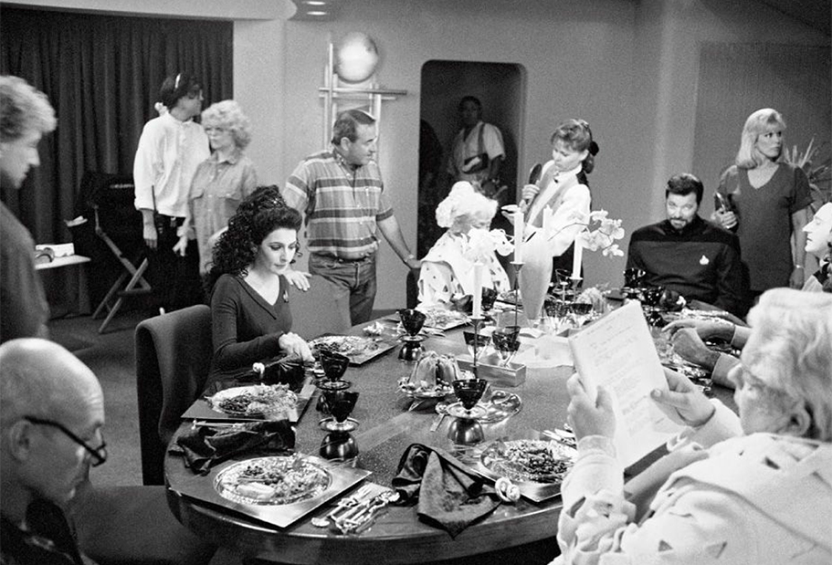 - Director Robert Wiemer was given permission from Rick Berman to use a number of different camera techniques to give the flashbacks a very different feel. While Berman was not usually a great believer in such techniques, he felt the nature of the story meant it was appropriate here. The scenes in "reality" were shot in a conservative manner to heighten the contrast. (Star Trek: The Next Generation Companion, 2nd ed., p. 189; Captains' Logs: The Unauthorized Complete Trek Voyages, p. 237) Special cameras were used: Panastar high speed cameras with a low angle-wide angle prism and 14910 mm lens and another one with a 100 mm macro lens. ("Violations" call sheet) For Beverly Crusher's flashback, actors Patrick Stewart and Gates McFadden sat on a camera dolly, creating a surreal floating effect. (Star Trek: The Next Generation Companion, 2nd ed., p. 189)