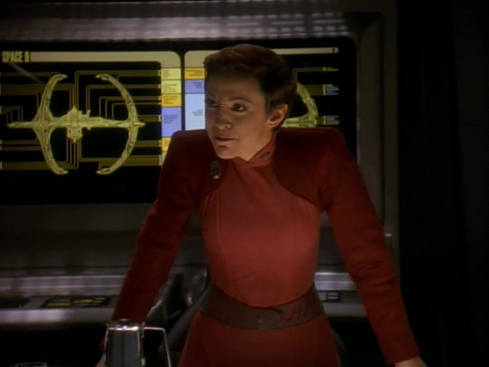 In the wardroom, Ruwon proclaims that the Dominion is the greatest threat the Alpha Quadrant has seen in the last century and wants to know exactly what Sisko and his crew have obtained through use of their cloaking device on the USS Defiant. When the commander admits they know very little of the Dominion, Karina responds, asking about Odo, incorrectly referring to him as a Founder. She believes he can tell them all they need to know about the Dominion, though Major Kira soon corrects her, informing her that Odo may be a Changeling but he is not a Founder and wants nothing to do with them. The commander backs her up by telling them it is the truth, "whether they chose to believe it or not". Ruwon reminds Sisko that they agreed to install the cloaking device in exchange for information on the Dominion, but they have received very little so far. He goes on to demand every piece of information Starfleet has on them no matter how insignificant, including any classified reports made to Starfleet Command. Sisko says he will have to clear it with his superiors first.