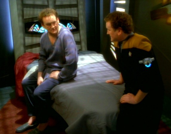 The new O'Brien wakes up in the infirmary next to Doctor Bashir, who asks how it went. After confirming it worked, O'Brien immediately contacts Sisko in Ops, who raises the station's shields and readies weapons. Bashir quickly realizes that this O'Brien is different; he doesn't have nearly as many delta isotopes in his body and his metabolic readings are completely different.