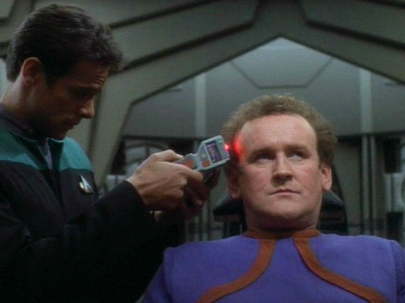 In the infirmary, Bashir has finally gets O'Brien to submit to his physical, though the chief isn't happy about it in the slightest, not hesitating to wind up the doctor with his sarcastic comments. After a few medical questions, Bashir asks him about his parents' health. Annoyed, O'Brien reminds him that his mother died two years ago and he has told Bashir all of this before, when his father remarried to a woman he has never met. Finally, frustrated by all of the questioning, he leaps to his feet and demands to know why the medical is taking so long. Suddenly, he comes to the conclusion that he must be dying and that's why everyone is behaving strangely. But before he can ponder on it any longer, Bashir calmly reports he is in perfect health and is free to go.