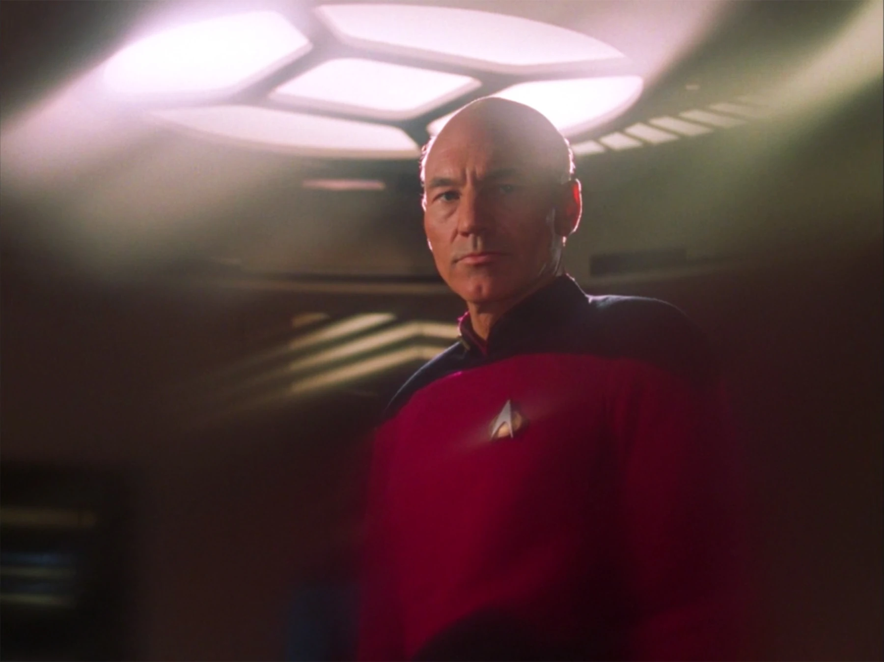 Riker contacts the Enterprise and reports that "we have a problem." He tells Picard that the Mintakans are beginning to believe in a god and the one they have chosen… is Picard.
