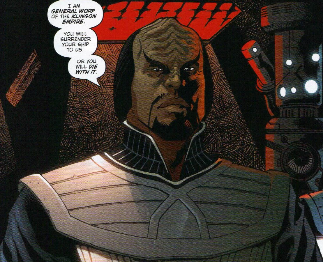 The alternate reality version of Worf appears in the third issue of the Star Trek: Ongoing story arc The Q Gambit where he is Chancellor of the Klingon colony of Earth after the Empire defeated the Federation and conquered Earth renaming it "Tera'." Worf is introduced to James T. Kirk, who instantly recognizes him and the Starfleet insignia and asks how he got here. Kirk explains that he and his crew were brought over a hundred years into the future by Q and Worf believes that both the crew of the USS Enterprise and the Klingons can be of mutual benefit to one another. Worf then prepares to meet with the advisory council over Sisko's intelligence reports and the events that brought Kirk and his crew to the future while also having rooms prepared for Kirk and his party when he is suddenly killed by his guards and Kurn, but it is revealed that they're actually Changelings who proclaim Earth is now under Dominion control.