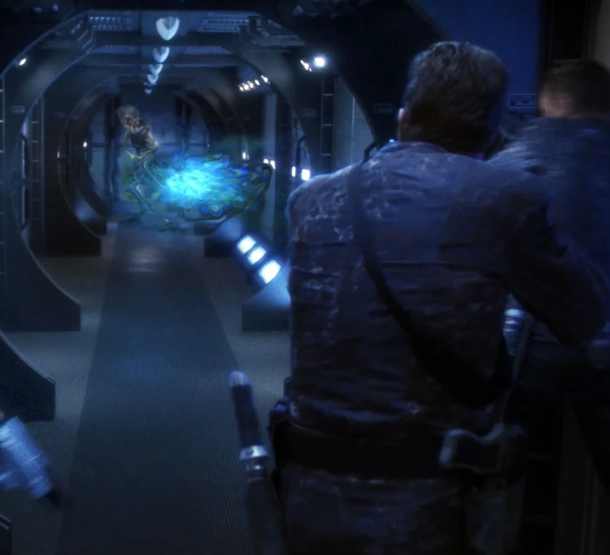 In the final draft script of "Rajiin", the Xindi-Insectoid rifle was described as "bizarre-looking." The fact it was to be a rifle was not disclosed in the script, where it was simply referred to as a "strange-looking weapon." Its output was described as "a rippling distortion wave [...] like concentric circles on a pond, but pulsing through the air."