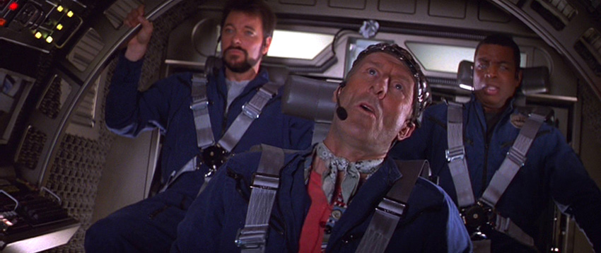 Zefram Cochrane on his historic warp flight with Riker and La Forge