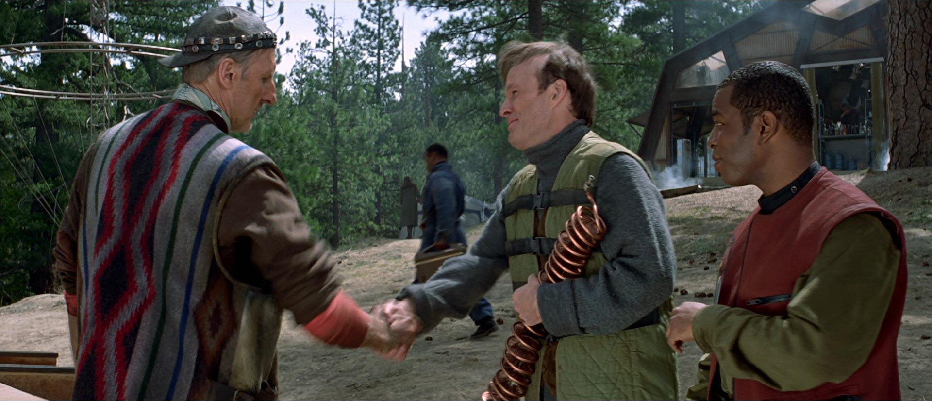 Cochrane greeting Kirk, Spock and McCoy in 2267