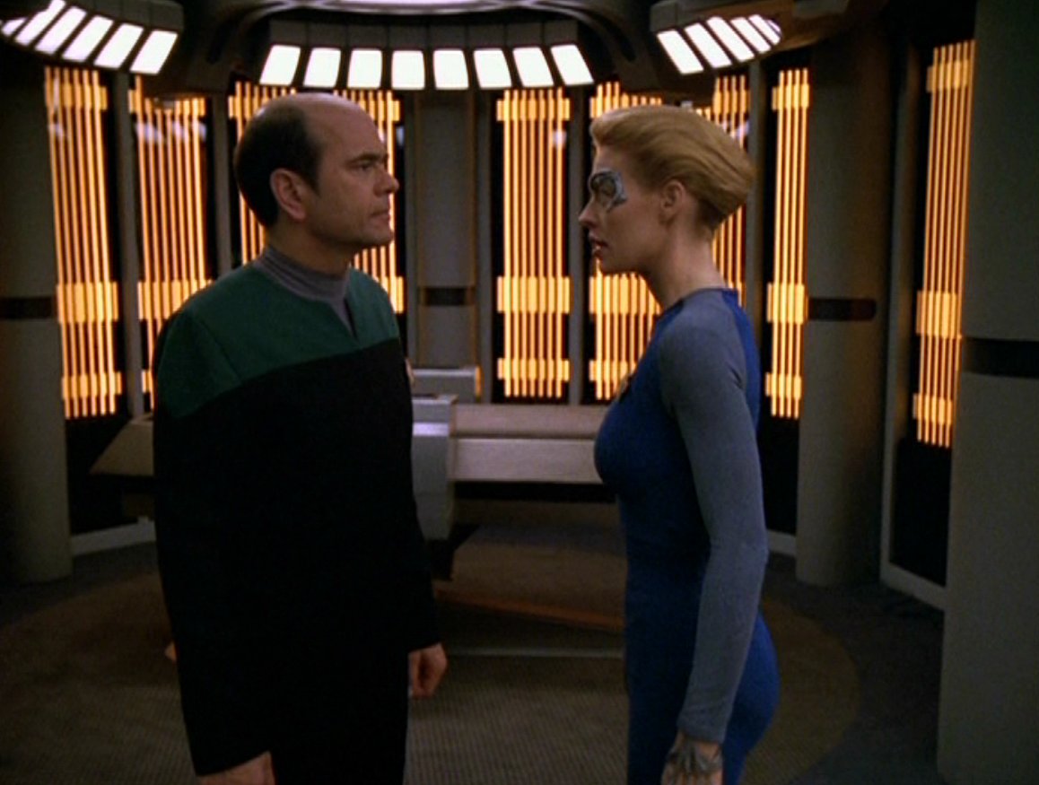 在 synthehol (一種酒精)的影響下,九之七告訴EMH醫生和一些航海家號船員,自己和他們都是「非常好的朋友」。(航海家號:《Timeless》)